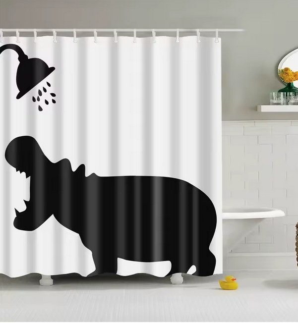 Duschdraperi Flodhäst är ett duschdraperi i svart och vitt. Duschdraperi Flodhäst kommer komplett med 12 stycken duschdraperiringar.