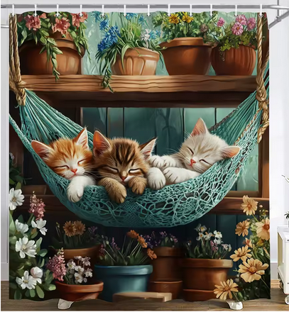 Duschdraperi Kattungar är ett duschdraperi med härligt mönster av de tre kattungarna som sover i hängmattan mot en bakgrund av olika blommor i krukor. Duschdraperi Kattungar kommer komplett med duschdraperiringar.