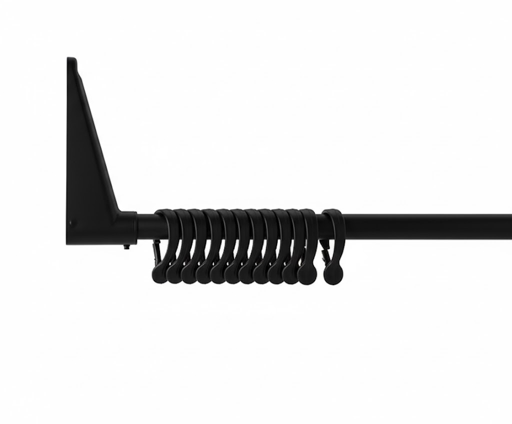Duschstången levereras komplett med 12 duschdraperiringar och vändbara stabila väggfästen som skruvas upp.