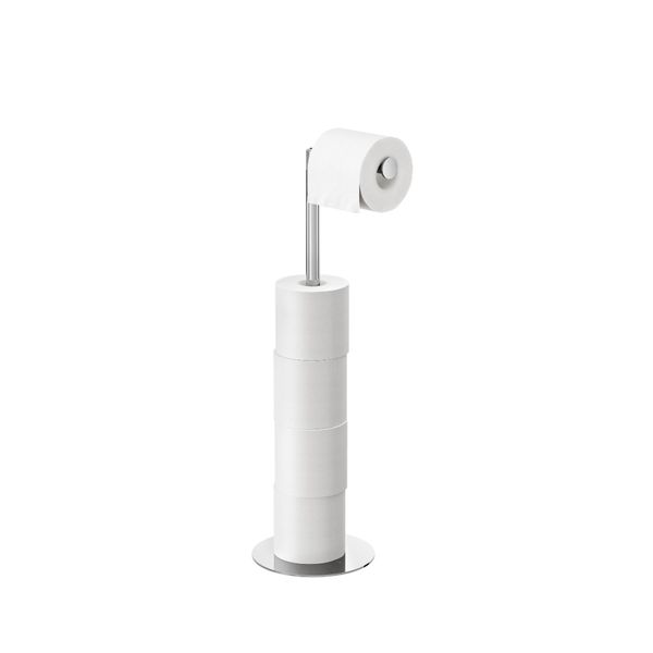 Toalettpappershållare i krom där du kan förvara reservrullar på stången. Vik upp handtaget och trä på reservrullarna. Rund fot, plats för 4 rullar. Höjd: 62cm
