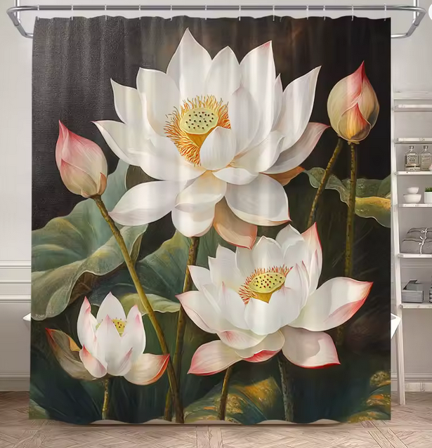 Populära och vackra duschdraperi Lotusblommor är ett duschdraperi som är mönstrat med vita lotusblommor mot en mörkare bakgrund i härliga toner som ger ditt badrum ett lugn. Duschdraperi Lotusblommor kommer komplett med duschdraperiringar.