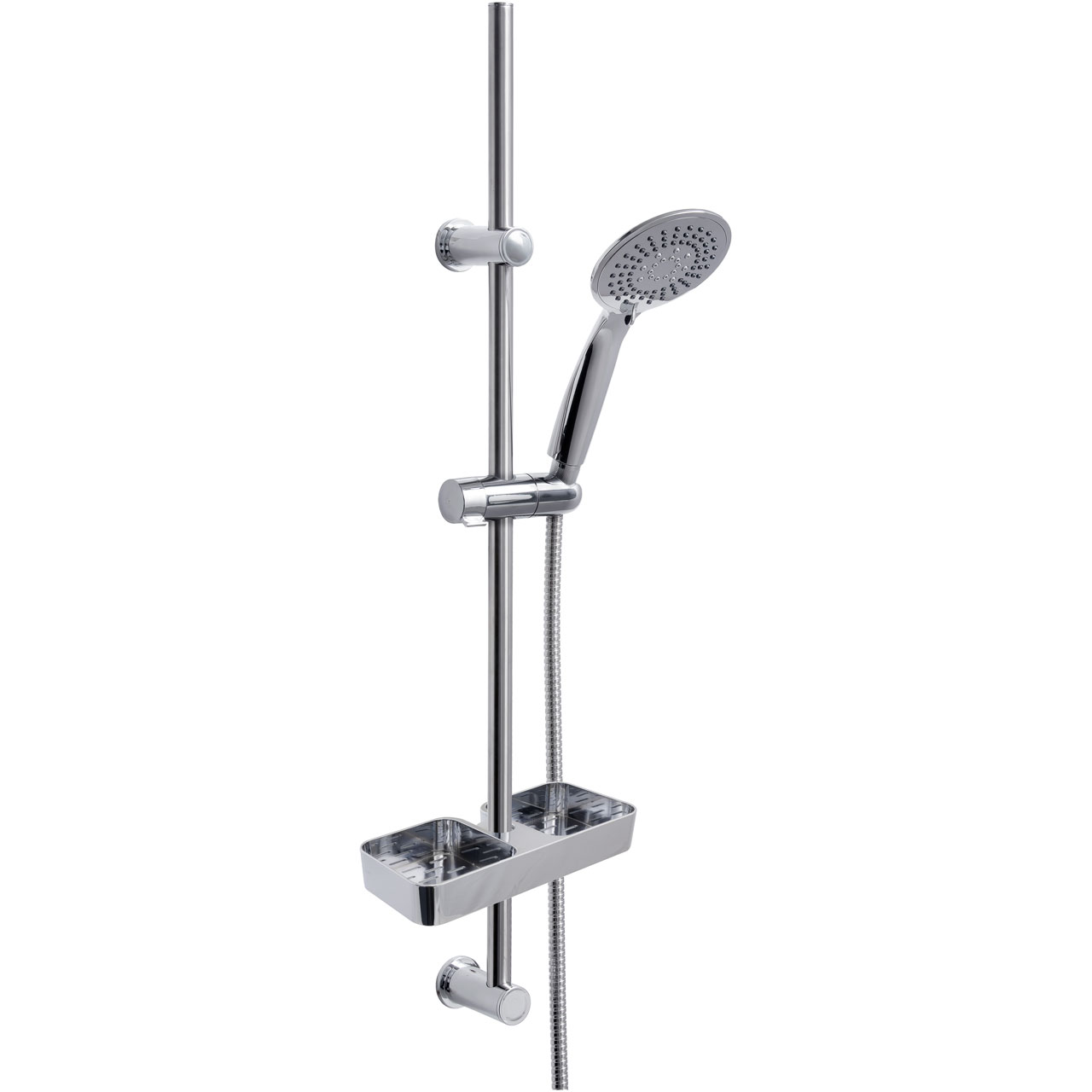 Schampohylla som enkelt klickas fast på duschstången (se bild). Passar stång Ø19 och Ø22 mm.